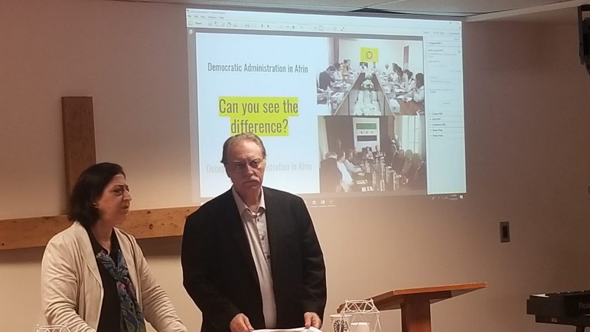 2018-05-20أُقيمت بتاريخ 19/5/2018 ندوة سياسية في كنيسة أبوستل في منطقة فيرفاكس الأمريكية وبحضور الكثير من رواد الكنيسة الأمريكان, حاضر فيها كل من السيدة سينم محمد وبسام اسحاق, تناولت الندوة الوضع السياسي في سوريا بشكل عام والاحتلال التركي لعفرين والانتهاكات التي تُمارس على المدنيين العُزل, بالإضافة إلى وضع مئات الألاف من المهجرين قسراً في مخيمات منطقة الشهبا على وجه الخصوص.