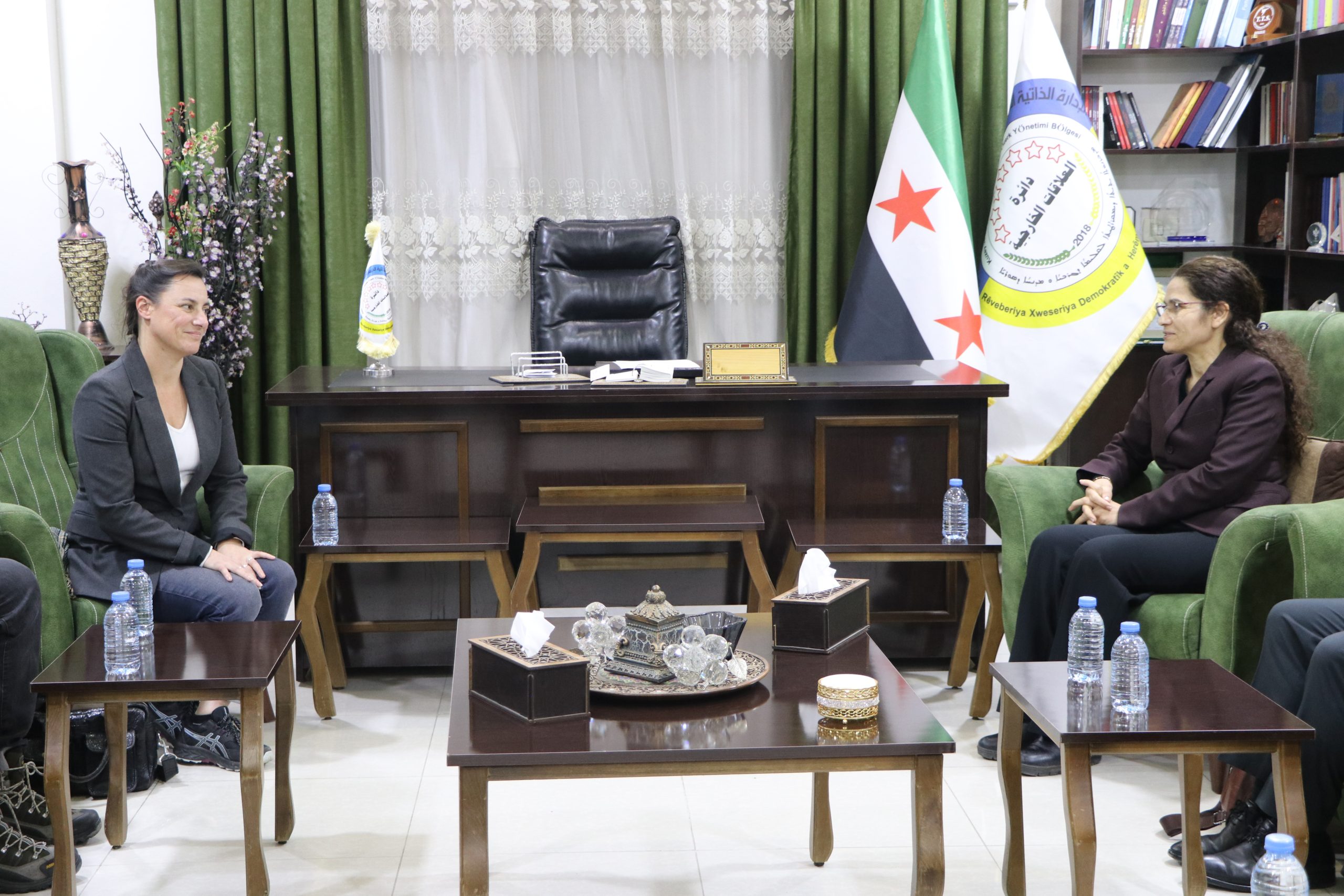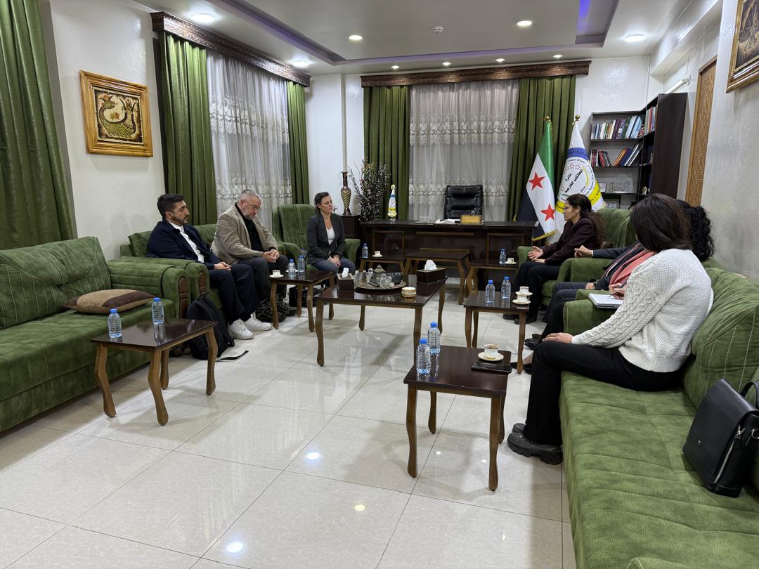 وكان في استقبال الوفد الرئيسة المشتركة لدائرة العلاقات الخارجية السيدة إلهام أحمد، ونائبتها السيدة كلستان علي، إلى جانب الدكتور عبد الكريم عمر، ممثل الإدارة الذاتية في دمشق.